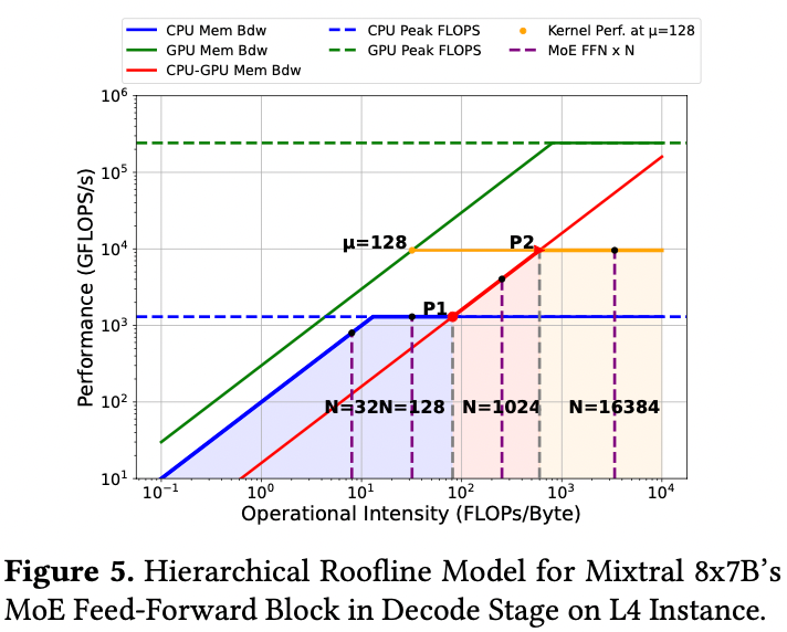 - 当 𝐼 小于 P2 对应的 𝐼 时,计算受限于 CPU 到 GPU 内存带宽,无法达到 P2 的性能。根据是否有足够的 CPU 内存来容纳更大的批次,可以增加批次大小或将一些权重静态地放在 GPU 上,因为这两种策略都可以增加关于 CPU 上数据的 MoE FFN 计算强度。