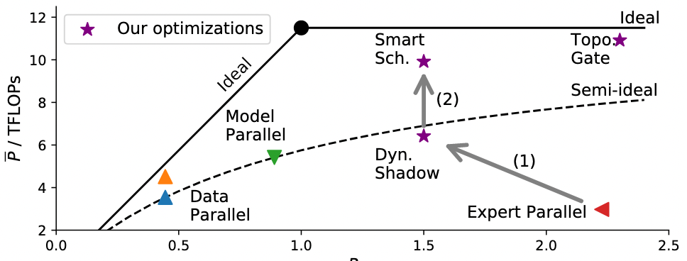 给个 example,FasterMoE 中 roofline-model 分析,并且给出了各种优化手段(降低访存量(通信量)/提高计算量)在 roofline-model 中的实际位置。